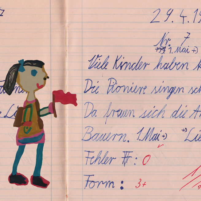 Ein Kaleidoskop, in dem sich das DDR-System selbst entlarvt und seine Mythen vom Sockel geholt werden. Den sinnbildlichen Sockel hat die Berliner Künstlerin und Filmemacherin ganz real freigeräumt für die Menschen, die hier leben oder vorübergehen und neugierig werden. Fünf farbige Betonelemente – maßstabgerecht verkleinert – laden zum Verweilen ein, zum miteinander Reden und dazu, sich eine eigene Meinung zu bilden.