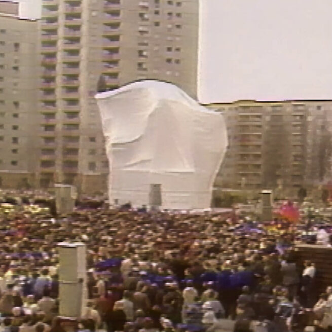 Das Kürzel E.T. kann kein Zufall sein. Vor den modernen Hochhäusern wirkte das Monument schon bei der Enthüllung wie ein Alien. In zehn Kurzfilmen umkreist Betina Kuntzsch die Geschichte des Ortes: des Denkmals und seines Namensgebers, aber ebenso die Geschichten von Menschen, die damit aufgewachsen sind oder heute hier leben.