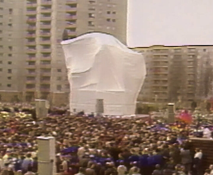 In 1986 the monument is unveiledInauguration of Ernst Thälmann Park. Hands are raised in greeting in the square and on the balconies of the new high-rise buildings. An army of little waving cats; though none look very jolly or cheerful.